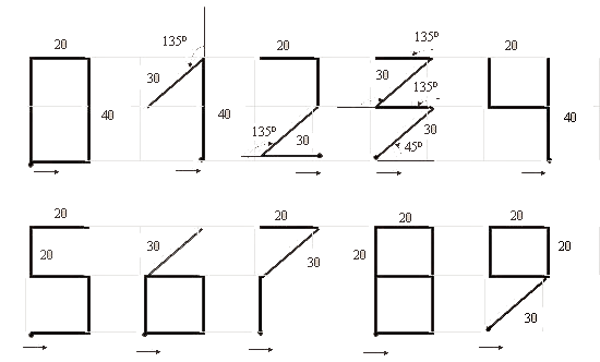 Составьте команды для рисования этих цифр. начальное положение ЧЕРЕПАШКИ указывает стрелочка.
